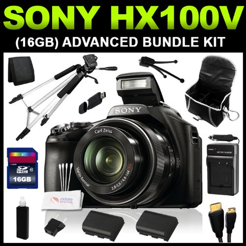 Sony Cyber-Shot DSC-HX100V 16.2 MP Exmor R CMOS Digital Still Camera with Carl Zeiss Vario-Tessar 30x Optical Zoom Lens and Full HD 1080 Video (16GB Advanced Bundle Kit) includes Charger, x2 Batteries, 16GB SD Card, USB Card Reader, HDMI Cable, Carrying Case, Mini Tripod, 57" Tripod and Cleaning KitSony Cyber-Shot DSC-HX100V 16.2 MP Exmor R CMOS Digital Still Camera with Carl Zeiss Vario-Tessar 30x Optical Zoom Lens and Full HD 1080 Video (16GB Advanced Bundle Kit) includes Charger, x2 Batteries, 16GB SD Card, USB Card Reader, HDMI Cable, Carrying Case, Mini Tripod, 57" Tripod and Cleaning Kit Detail : ***Included in your Cyber-shot DSC-HX100V Digital Camera (16GB Advanced Bundle Kit)***