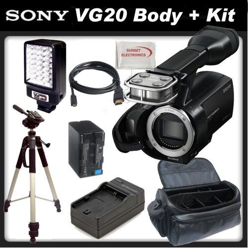 Special Offers Sony NEX-VG20 Interchangeable Lens HD Handycam Camcorder (Body Only) + Kit - Includes: Stabilizing Handle/Grip, Video Light, Full Size Tripod, Replacement NP-FV100 Battery Pack, Rapid Travel Charger, Carrying Case & SSE Microfiber Cleaning Cloth Now.