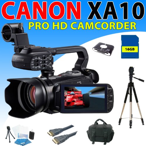 Canon Xa10 Xa-10 Hd Professional Camcorder + 16gb Sdhc Memory + Professional Camcorder Case + Tripod and More (16gb Deluxe Kit)Canon Xa10 Xa-10 Hd Professional Camcorder + 16gb Sdhc Memory + Professional Camcorder Case + Tripod and More (16gb Deluxe Kit) Detail : The Canon XA10 HD Professional Camcorder is a fully featured, ultra-compact pro video camera that shares nearly all the functionality of the XF100, but in an even smaller, run-and-gun form factor. Sporting a 64GB internal flash drive and two SDXC-compatible card slots, the XA10 can record literally for days without running out of memory. Able to capture AVCHD video at bitrates up to 24Mbps, the camcorder's native 1920 x 1080 CMOS sensor also lets you choose 60i, 24p, PF30, and PF24 frame rates for customizing the look of your footage. Bringing further professional oomph to that footage is a Genuine Canon 10x HD video lens, with lowlight sensitivity to f/1.8 and a 35mm equivalent zoom range of 30.4mm-304mm.